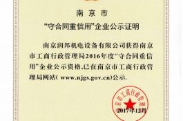 2017年12月29日,接到南京市企業(yè)信用管理協(xié)會(huì)通知,潤(rùn)邦公司再次通過2016年度市級(jí)“守合同重信用”企業(yè)的認(rèn)定。誠(chéng)信潤(rùn)邦,傾心服務(wù)。潤(rùn)邦始終把合同管理、信用